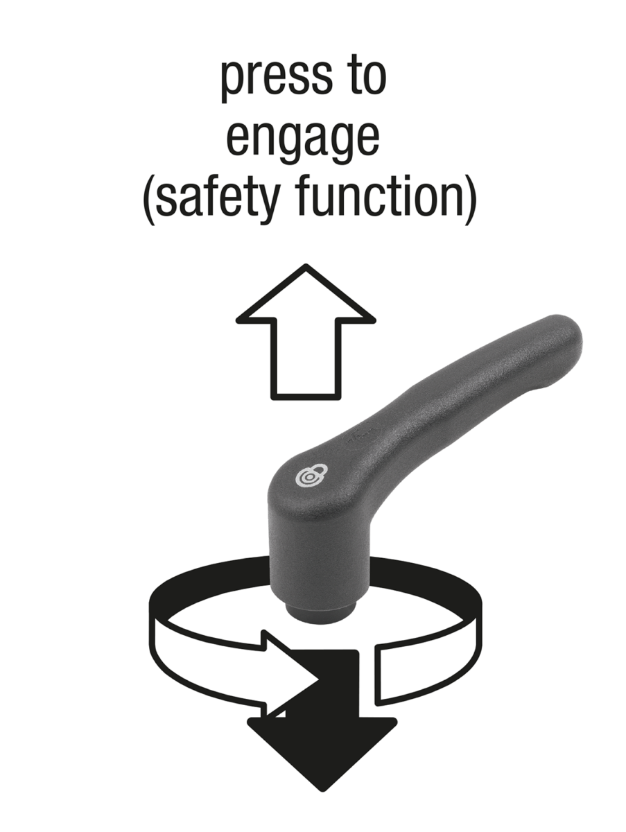 In the default position, the lever can be freely rotated and has no connection to the clamping point. The grip lever only engages when pushed down and the clamp can the loosened or tightened.