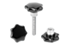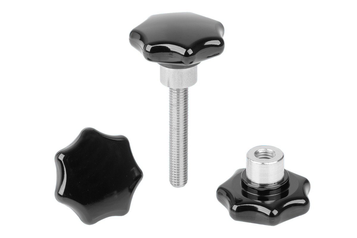 The thermoset star grip is distinguished by its closed grip contour. The contact surface of the protruding steel bush is vertical to the thread axis and ensures a firm screw connection.