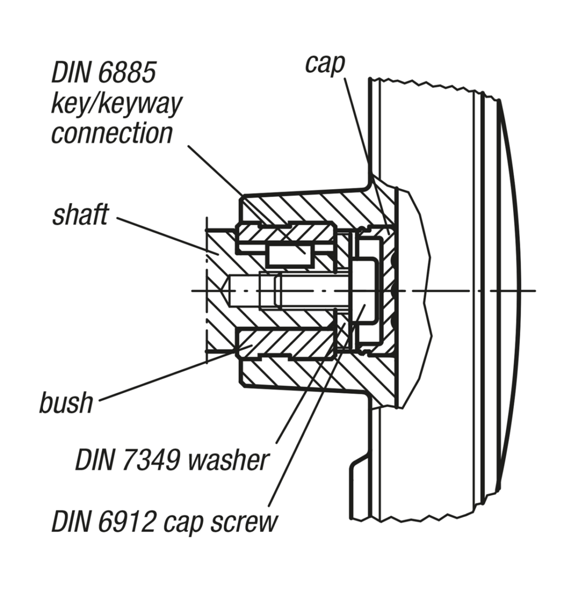 The handwheels can be secured to a shaft using a transverse pin or by parallel key connection together with a DIN 6912 cap screw and a DIN 7349 washer.