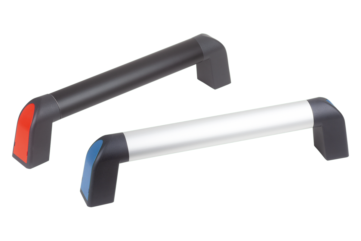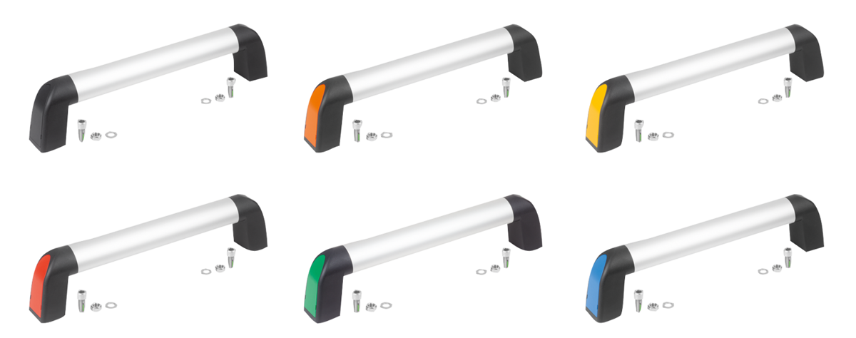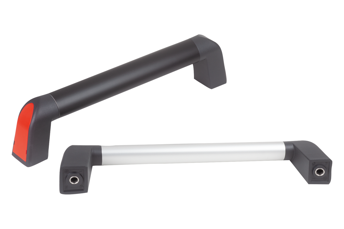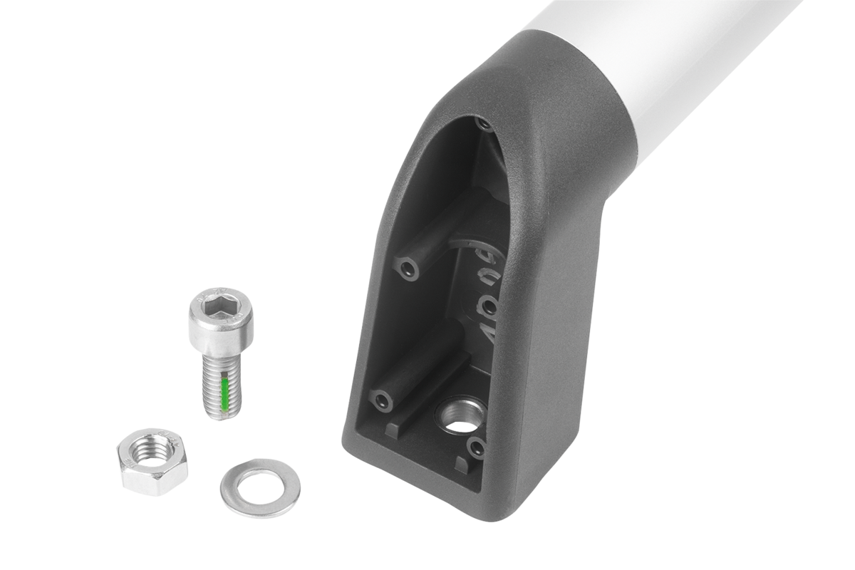 The end pieces are designed so that the tubular handle can be fastened either from the front or rear. DIN M8 cap screws or hex head screws are provided for this purpose. After mounting, the end caps can be pressed in by hand. Slots are provided on both sides of the end caps so that they can be removed with a screwdriver without damaging them.