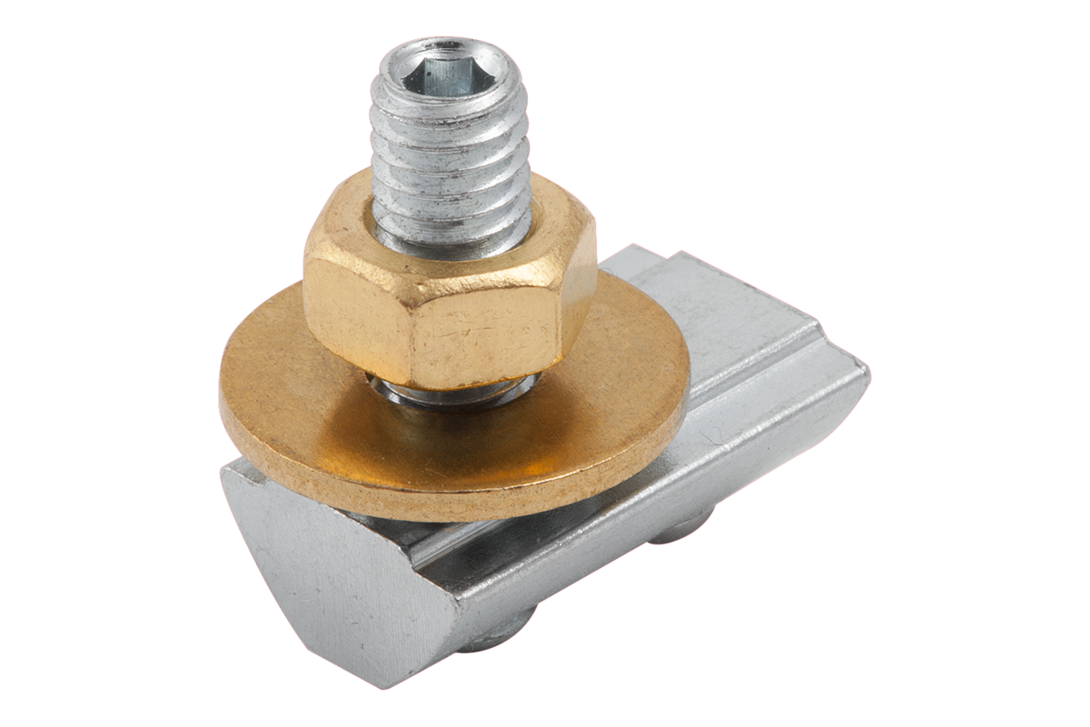 For protecting installations and persons. Connectors for earthing aluminium profile structures and interconnecting the aluminium profiles by integrating them into the protective earth (PE) system. Conductive contact is established through defined destruction of the oxide layer in the slot base and on the slot flanks.