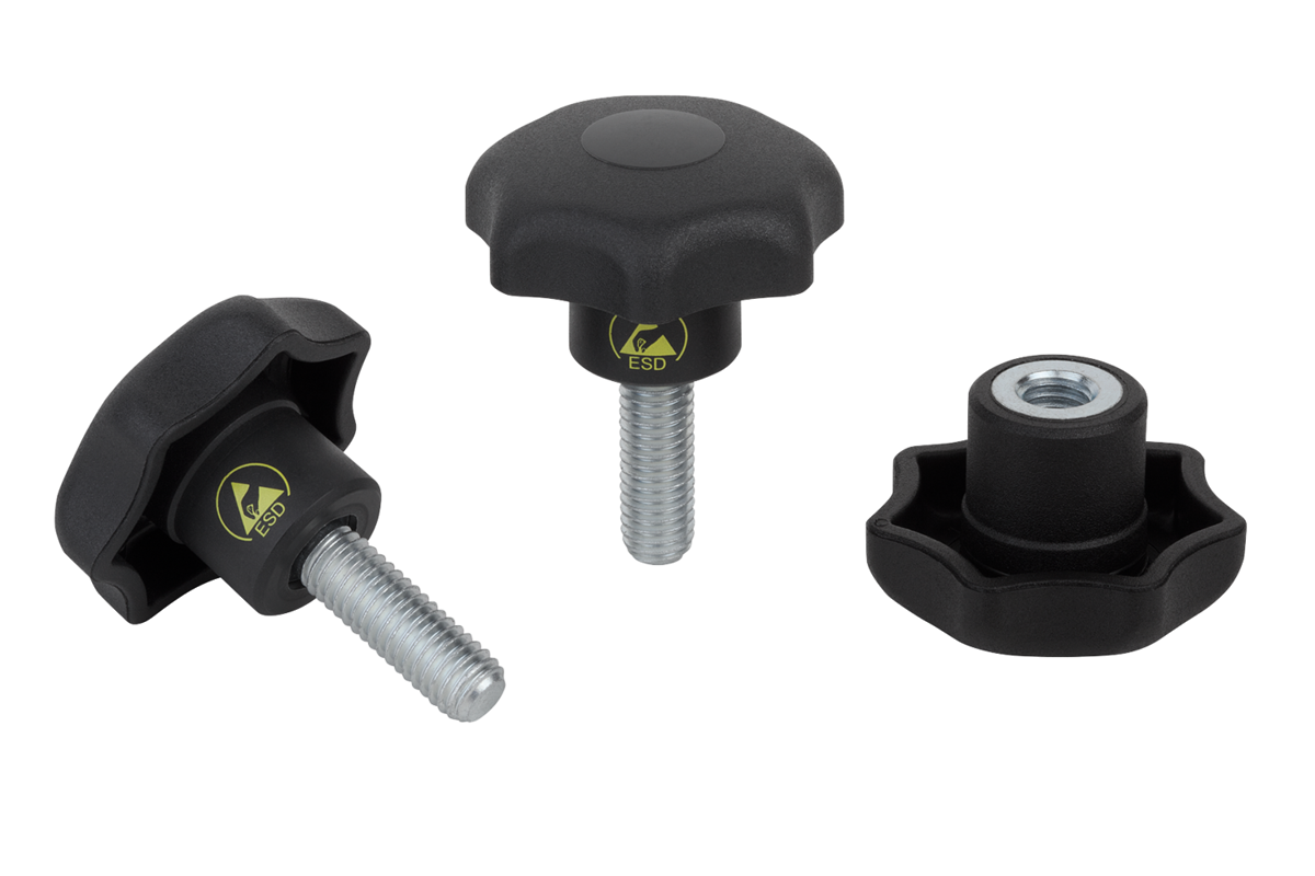 Bouton étoile antistatique similaires à DIN 6336, avec vis, forme L