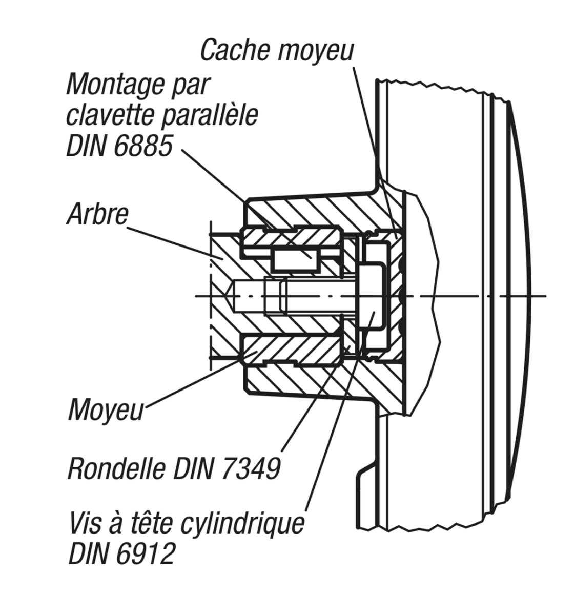 Les volants se fixent sur l’arbre soit à l’aide d'une goupille transversale, soit suivant le sens axial à l'aide d'une vis CHC DIN 6912 et d'une rondelle DIN 7349 avec assemblage par clavette.