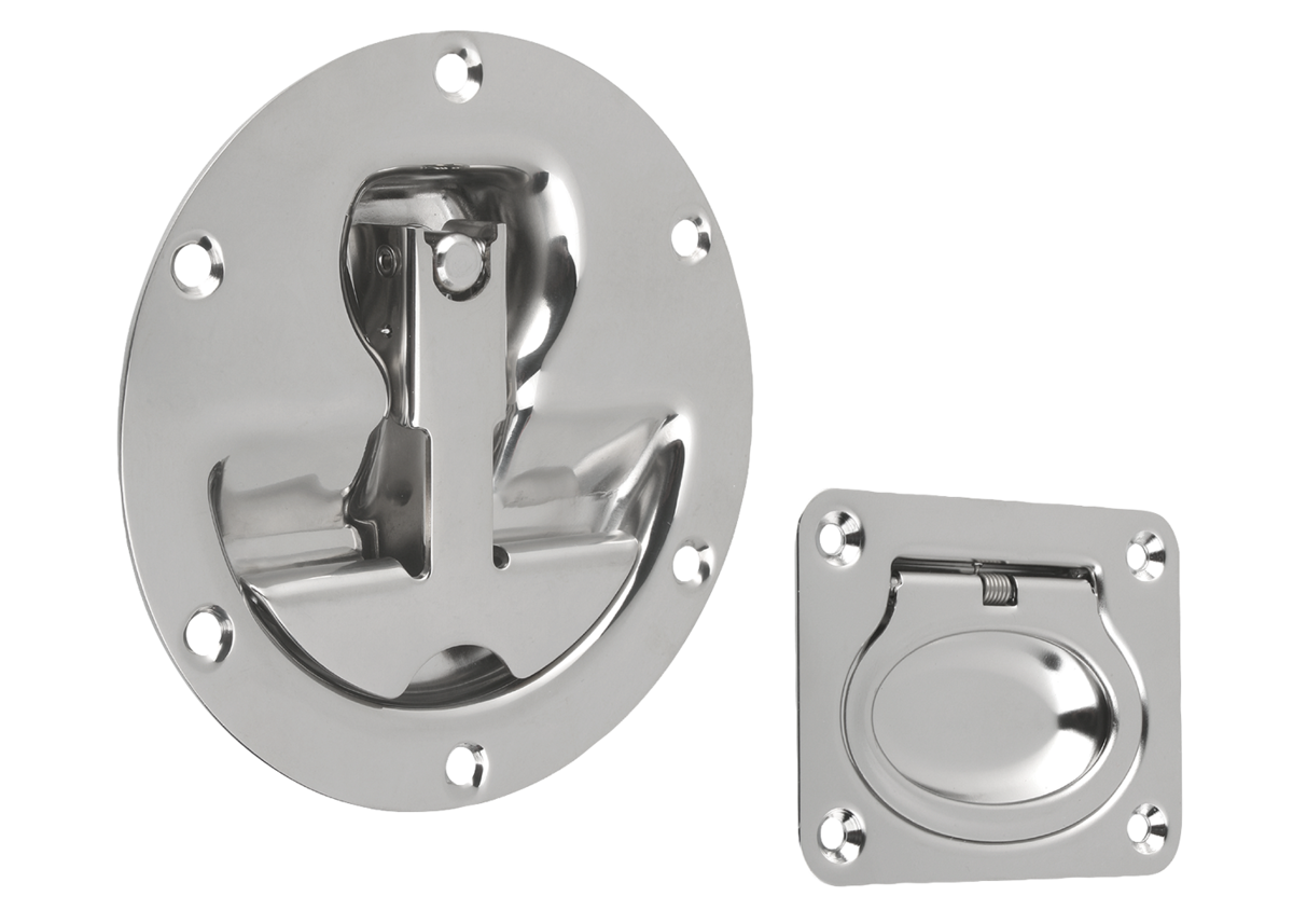Rvs klapgrepen met geringe inbouwdiepte. Voor vloer- en montageplaten of lades. Met terugstelveer. Na bediening zwenkt de greep zelfstandig terug naar de rustpositie.