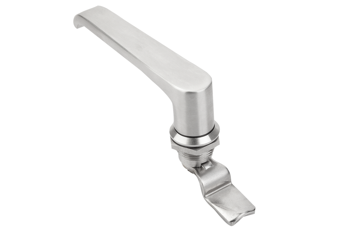 Draaigrendel met L-greep. Rechts of links toepasbaar met een sluitweg van 90°. De draaigrendel kan voorgemonteerd worden ingebouwd. Levering met standaard roestvrij stalen moer. Beschermingsklasse IP65.