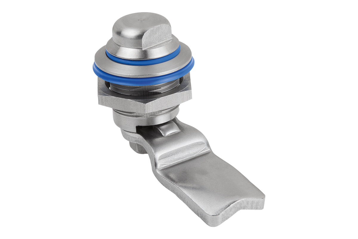 Draaigrendel van roestvrij staal met bediening voor sleutelwijdte 13 mm voor toepassing met hygiënische eisen conform de DIN EN ISO 14159, DIN EN 1672-2:2009*. Water- en stofbescherming conform IP69K). Door de vormgeving met radii en gepolijste oppervlakken in combinatie met het gebruikte materiaal bijzonder goed reinigbaar en vervuilingsongevoelig. De afdichting tussen draaigrendel en deur is uitgevoerd met de onverliesbaar aangebrachte PUR-schuimafdichting aan de onderzijde van de draaigrendelbehuizing.