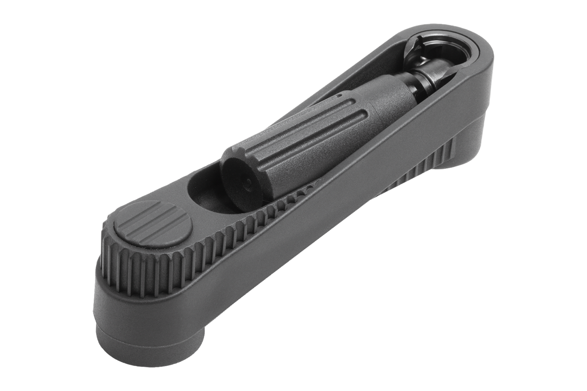- Greep in axiale richting tegen de borgpositie drukken. In ingedrukte positie kan het gemakkelijkst worden gedraaid met de greep. Als u de greep loslaat, zwenkt deze automatisch terug.