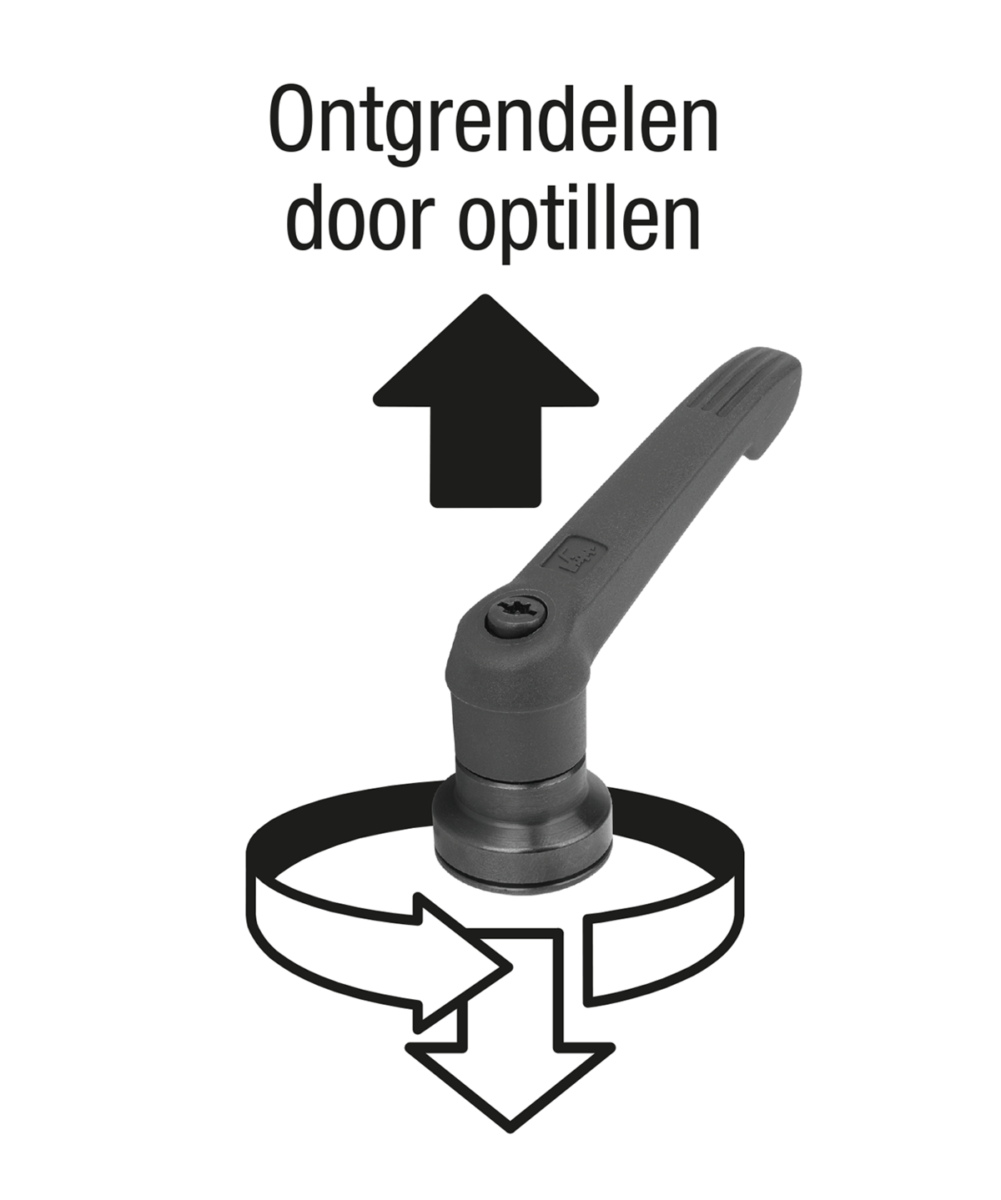 De handgreep is met behulp van een tandkrans in onbediende toestand in het vertandingsinzetstuk vastgezet. Daardoor wordt de schroefdraad vast of los gedraaid. Door het optillen van de handgreep kan deze in positie worden omgezet en met behulp van de veerkracht weer in de tandkrans worden vastgezet.