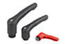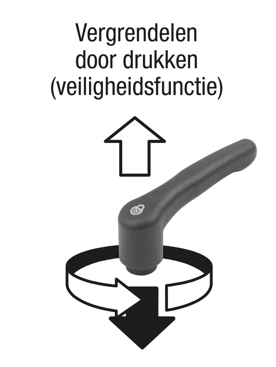 In de uitgangsstand kan de hefboom vrij worden gedraaid en is niet verbonden met de klemplaats. Pas door het indrukken van de handgreep klikt de vertanding vast en kan de klemming worden losgedraaid of vastgedraaid.
