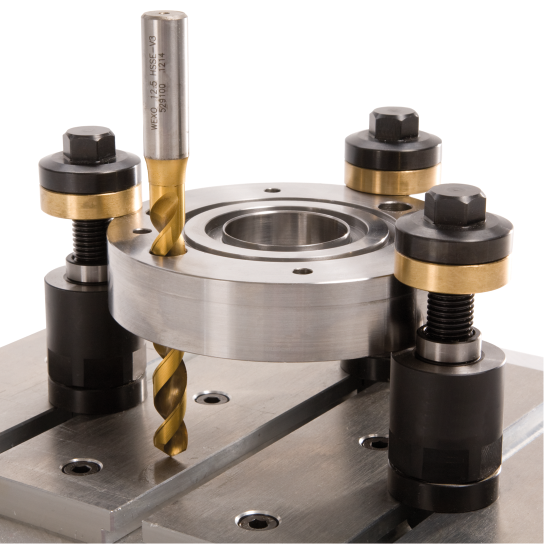 De tussenring voorkomt beschadigingen aan de machinetafel en verschuiven bij het vastdraaien. De spanring van messing voorkomt afdrukken op het werkstuk.