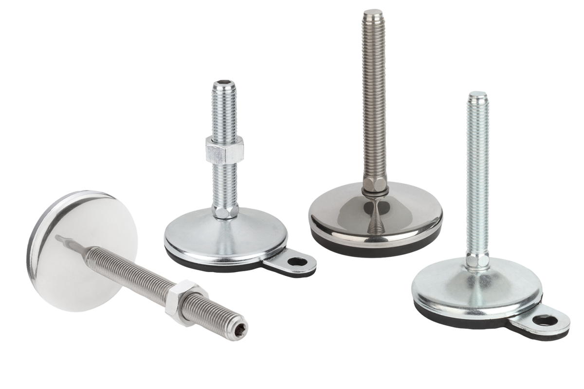 Stelvoeten van staal of rvs met draaibaar gelagerde schroefdraadspil en rubberen antisliplaag. De massieve rubberen antisliplaag is door vulkanisatie vast met de plaat verbonden. De rubberen antisliplaag heeft een uitstekende grip op de vloer. Deze werkt contactgeluiddempend en bemoeilijkt de overdracht van trillingen en stoten op de vloer.